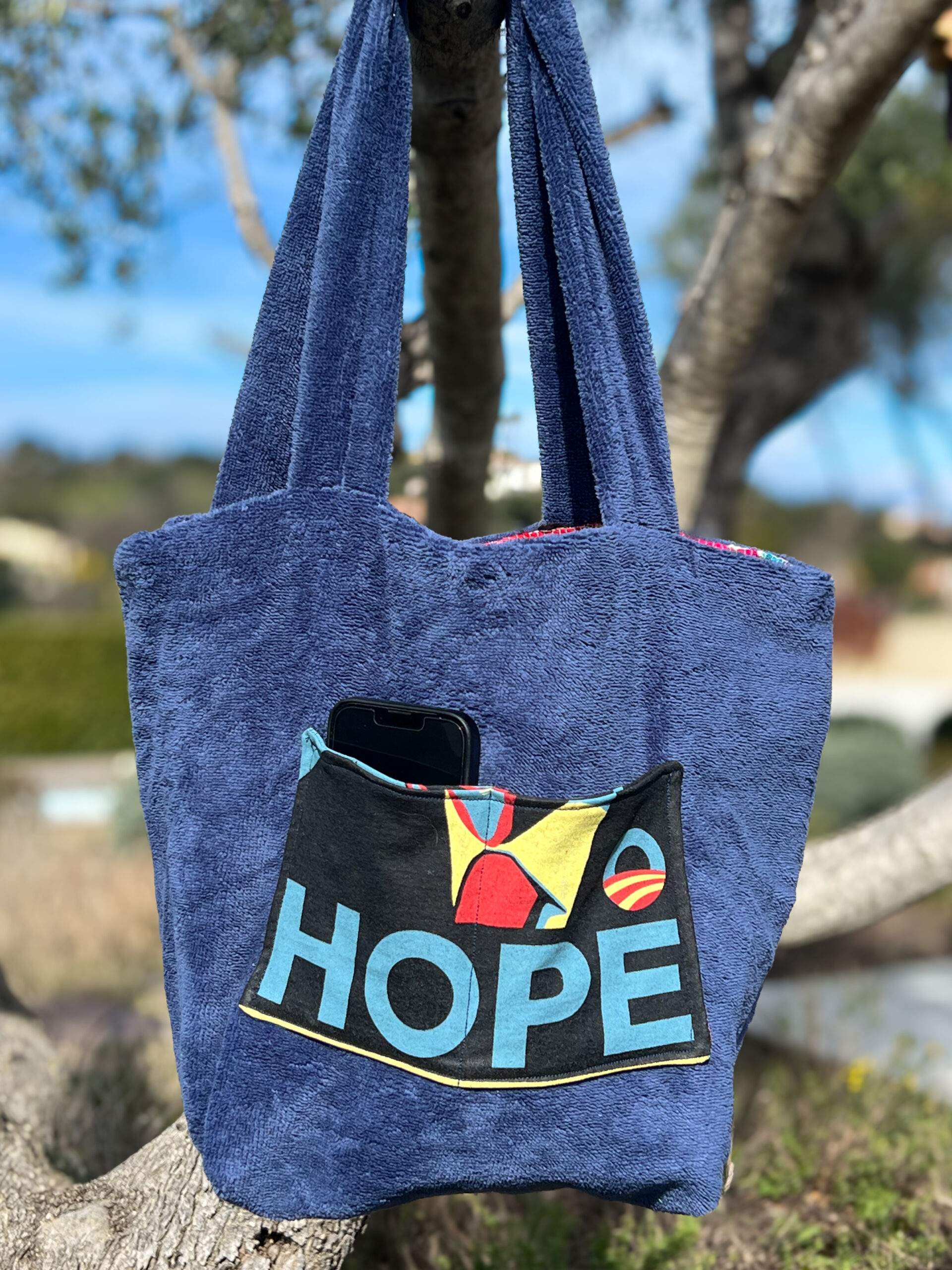 Sac réversible, en tissu/éponge bleu , avec poche.